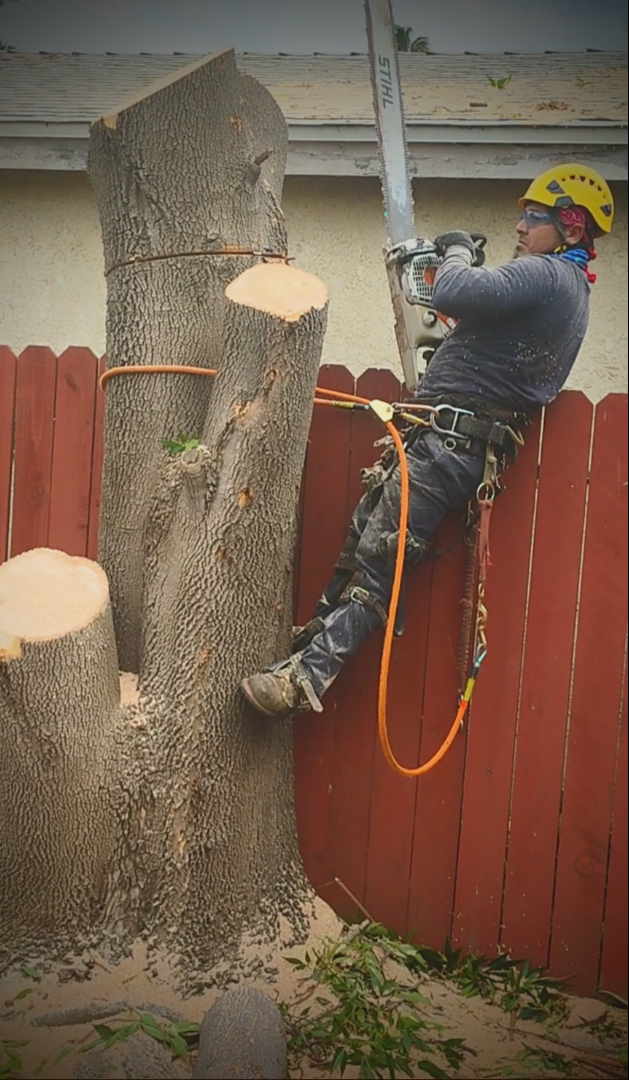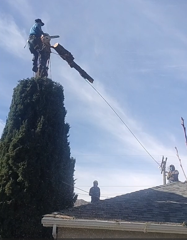 Roping down an elongated Italian cypress tree, using a butt-hitched method.
