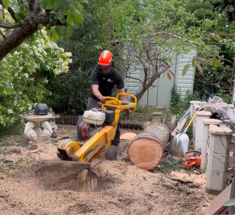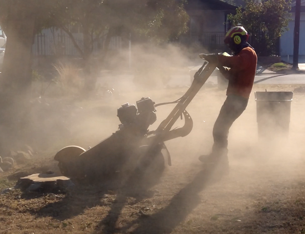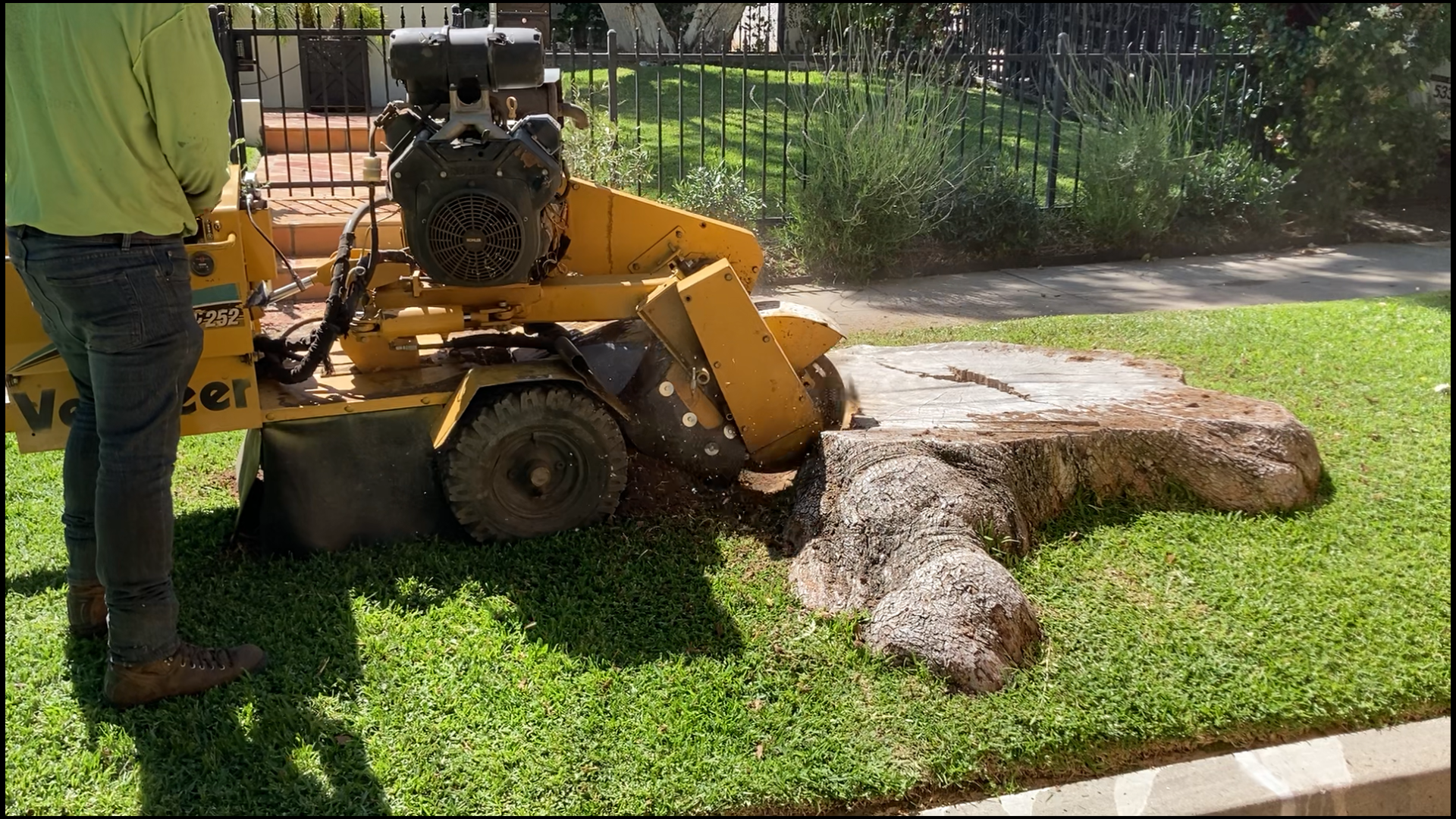 Removing a stump involves using a stump grinder, sweeping back and forth.